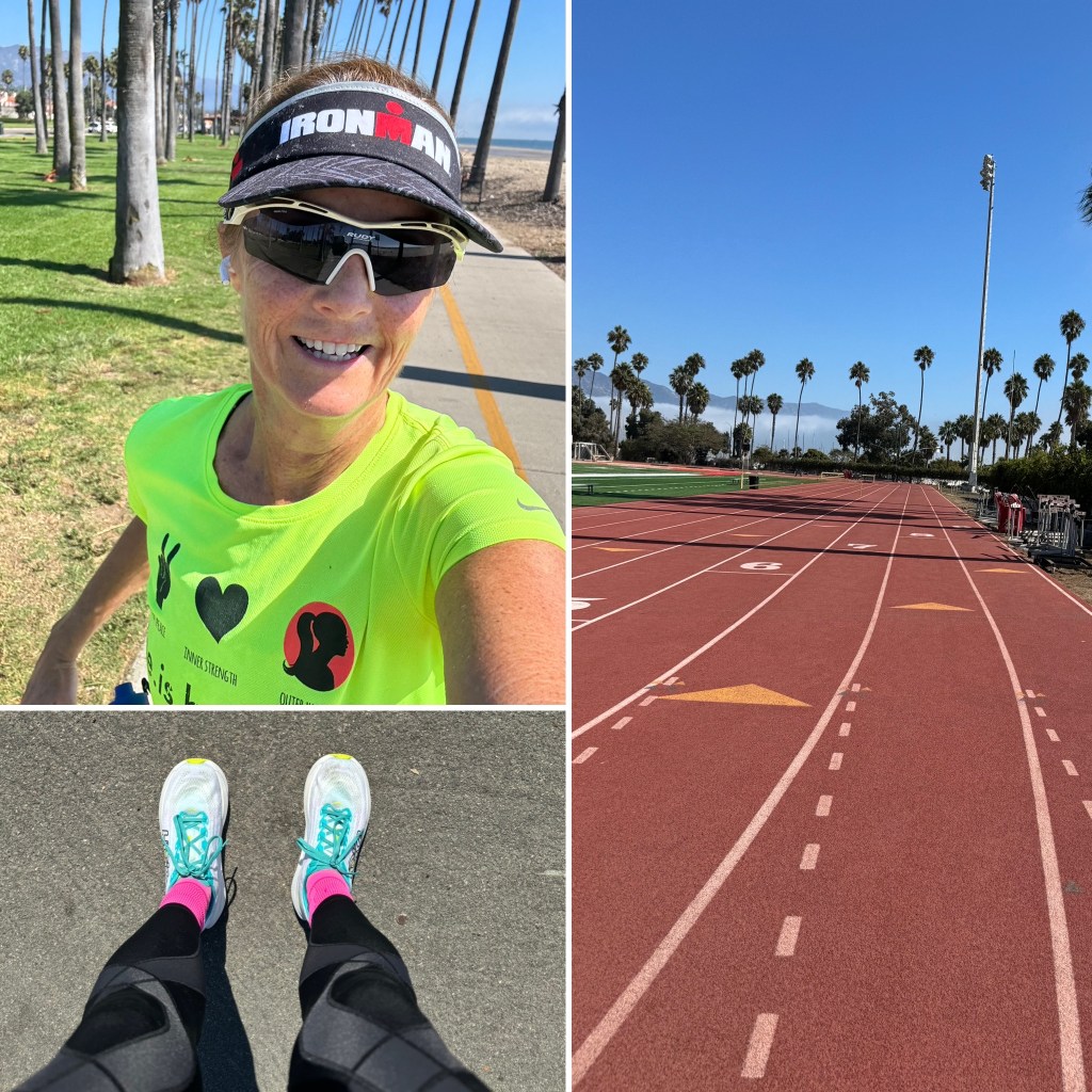 Thursday: As we count down the days and hours to race day, I’m trying to do more runs around the time I know I’ll be running through the streets of NY. I started at noon for this run when the temperature was 69 degrees with 68% humidity. Sounds like pretty great conditions, but it quickly felt much hotter than that, offering me ample opportunity to work on cooling techniques and staying laser focused on hydration and salt intake. With my tender anterior tibialis taped up again, I wanted to test out how it would feel to wear full compression tights and compression socks pushed down during the race on a warm day. Although it felt a little “sausauge-like,” the extra support was also nice as I knocked out 4 miles on the soft surface of SBCC’s track, then 3.7 miles on the waterfront bike path.