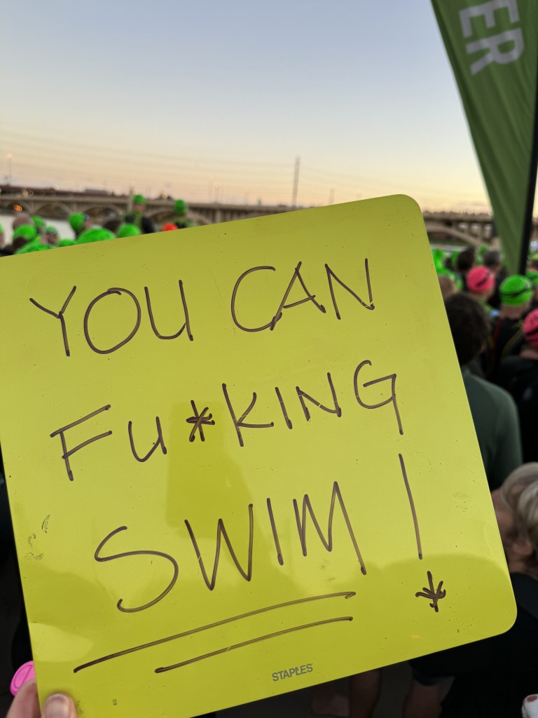 Because I can’t help myself sometimes, about ten minutes later I decided to circle back and add some levity, and also remind them they were totally capable of conquering this distance within the 2:20 cut-off time. I started hollering over the crush of swimmers: “Heyyyy Scott and Jessssss!” Then I held my neon green dry board sign high above my head with a slightly inappropriate reminder of their abilities. They looked around, trying to figure out where my voice was coming from, then were soon helped by fellow swimmers who pointed in my direction. Watching the two finally spot my message and totally bust up as they read “YOU CAN FU*KING SWIM” was pure gold. My greatest hope was that it helped them relax enough to enjoy the swim, and set a light and empowering tone for the day.