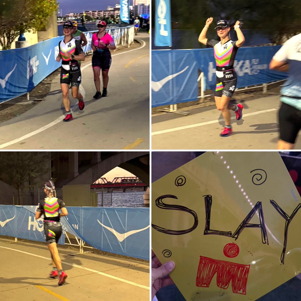 Next came Jess who looked surprisingly fresh and cheery, pumping her fists in the air and laughing at the “SLAY” sign I held as I cheered for her. Her gait and body language had Ironman written all over them. I knew she was going to cross the finish line.
