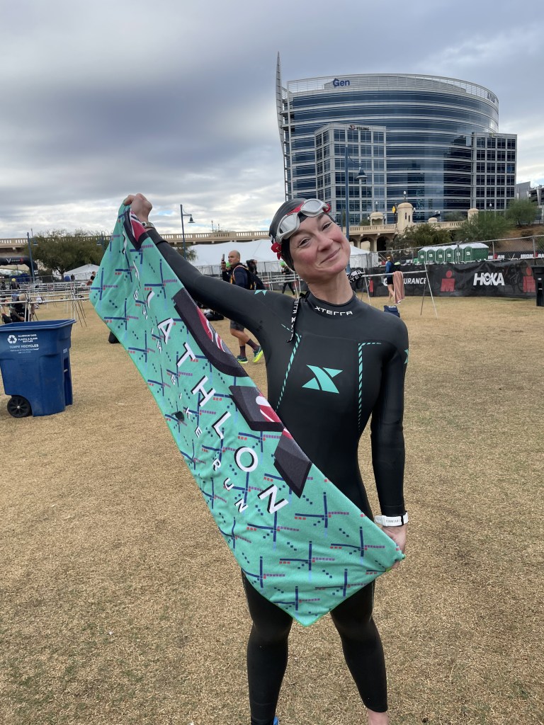 JESS: I don’t do a lot of “road races” and I can’t believe how amazing the support feels at an Ironman. I’m used to the quiet of an ultra marathon where you can be alone on the trail for hours. I felt uplifted the entire race. I am definitely planning on volunteering at my local Ironman race in Salem next year. I want to give back that feeling to others! Arizona was special. The swim, even though I was nervous, was a really comforting body of water to be in. You can see both sides of the lake as you swim and I liked being able to spot the bridges I needed to swim under. The bike was beautiful, windy and challenging. The Arizona scenery helped the miles fly by. I really enjoyed the run as the sun set. Everything was lit up and there was this particular building across the river that was all lit up in blue lights and it made the night feel like a party!