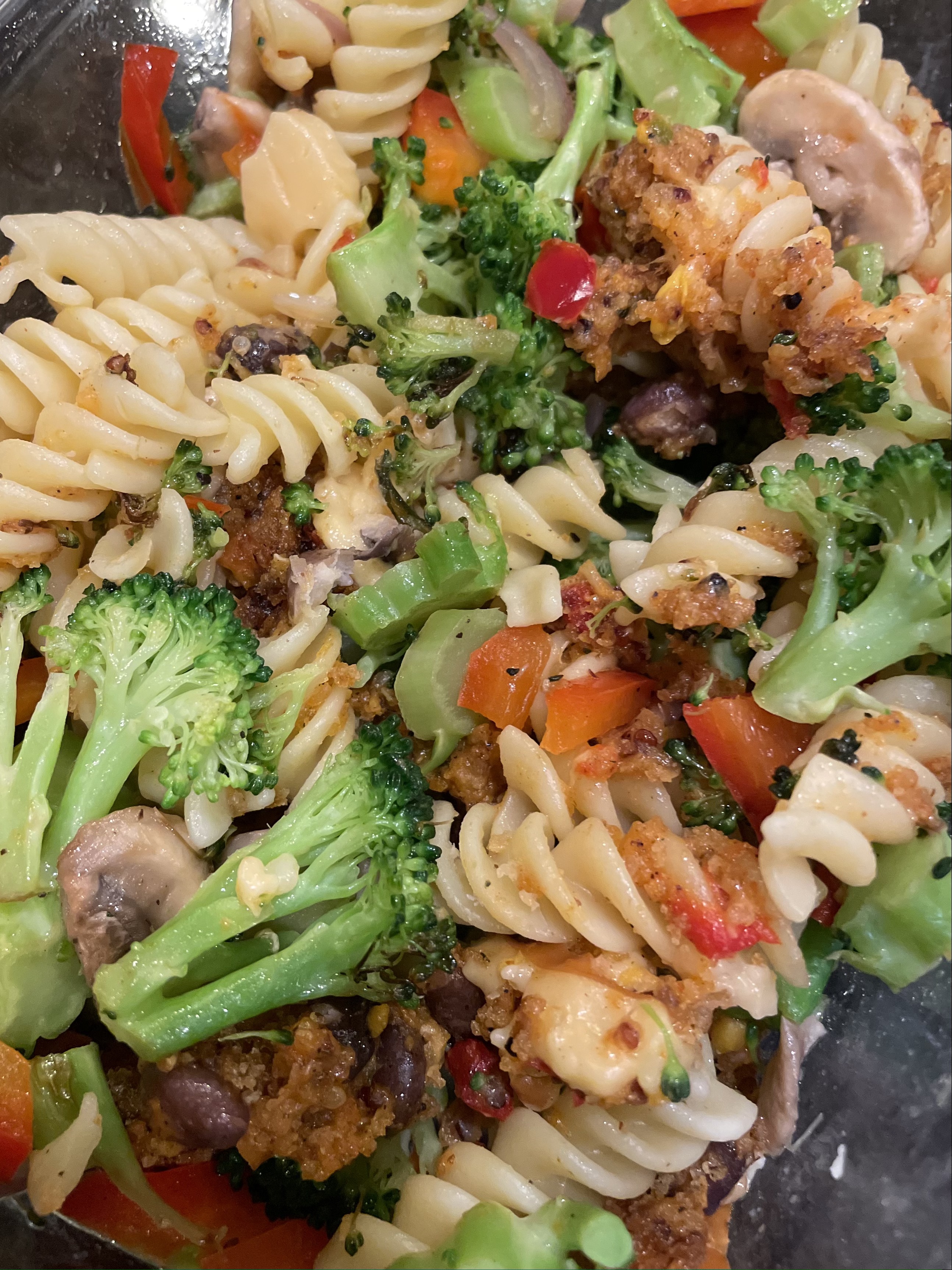 Leftover mash-up: I’m the queen of throwing something together from leftovers, adding in a few fresh items to spice it up. This mash-up included fresh broccoli, bell peppers, mushrooms and red onions sauteed in garlic olive oil for a few minutes, and then tossed over leftover plain pasta. For extra flavor and protein (5g), I threw in a chopped up Trader Joe’s Quinoa Cowboy veggie burger with black beans & roasted corn.